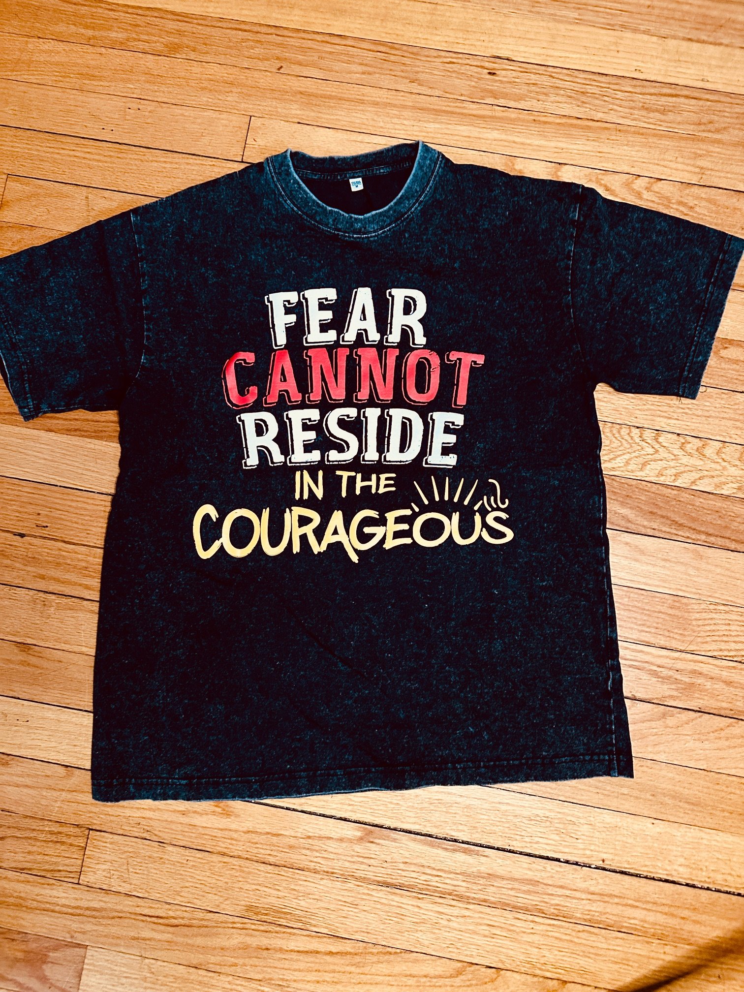 “FEAR CANNOT RESIDE IN THE COURAGEOUS” — with a flash of yellow that shines through the phrase, igniting confidence and courage.